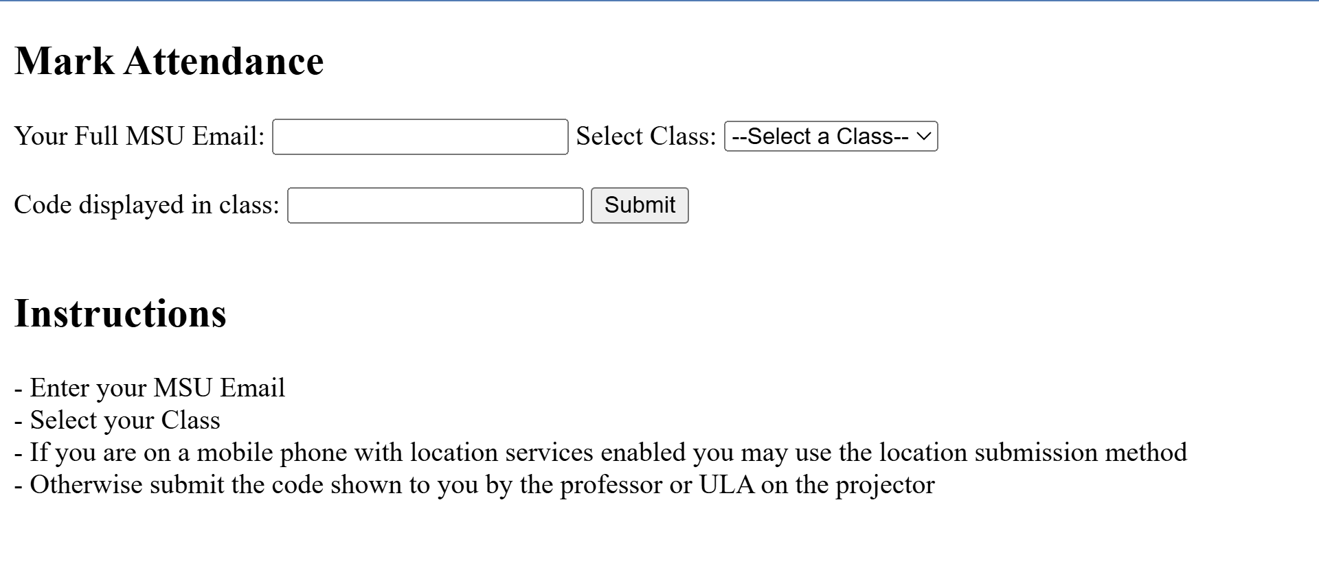 In practice, the code generation was done live at the start of class, projected on the screen for all students to see. Students would then access the same attendance link each day, enter the generated code along with their MSU email, and select the correct class—just as instructors did—ensuring the system referenced the proper Google Sheet. The application first verified the entered code by comparing it against the current valid code stored in the sheet. If the code was incorrect, the student would receive an error message prompting them to try again. Once the correct code was entered, the app would search for the matching email address in the selected sheet to identify the appropriate row. It then parsed the sheet’s header row to locate the current date, identifying the correct column. With both the row and column located, the app marked the corresponding cell as "true," effectively logging the student as present for that day. This seamless system made attendance fast, reliable, and easily scalable across multiple classes.