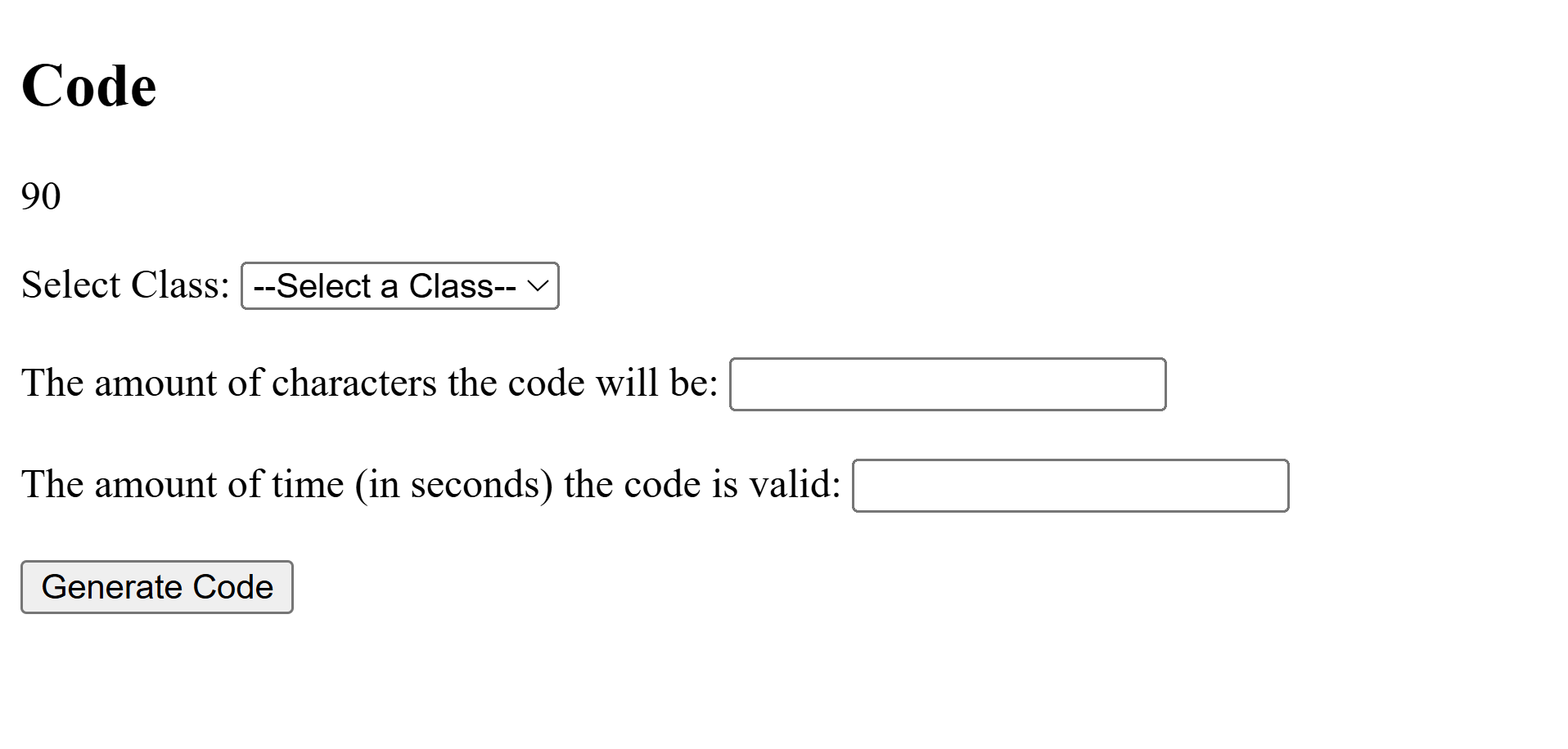 Due to concerns over the first design, I expanded the application’s functionality to allow instructors to generate unique attendance codes. Once generated, each code was automatically stored in a connected Google Sheet, where it could later be validated against student input. To provide flexibility, I implemented options to configure the length of each code and its validity duration in seconds. Additionally, since the tool was used across all three of my supervisor’s classes, I added a dropdown to select the appropriate course, ensuring the code and attendance data were directed to the correct spreadsheet. This made the system scalable, adaptable, and easy to use across multiple class sections.
